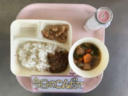 10月30日(月)の献立は「鶏肉のたつたあげ・あつあげと野菜の煮もの・おかかなっ葉・ごはん・牛乳」でした。鶏肉のたつたあげは子どもたちに人気の献立です。今日も完食でした。おかかなっ葉は給食室で作る手作りのふりかけです。かつおぶしとだいこん葉、いりごまを使用した優しい味つけのふりかけです。ごはんが進みました。
