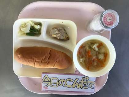11月1日(水)の献立は「かつおのガーリックマヨネーズ焼き・スープ・キャベツと三度豆のサラダ・黒糖コッペパン・牛乳」でした。塩、こしょうとにんにくとマヨネーズで味つけして焼いたかつおは食べやすかったです。スープには、これからがおいしくなるカリフラワーが入っていました。