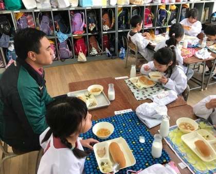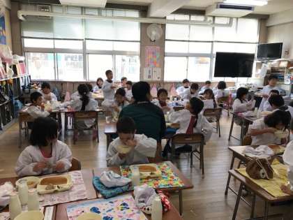 C-NETのアルビー先生が、1年生の教室で一緒に給食を食べました。子どもたちは、アルビー先生の訪問に大喜びで、とても楽しい給食の時間を過ごしていました。