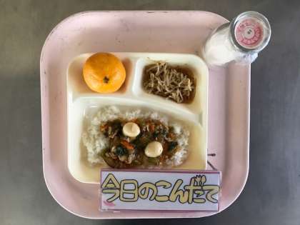 11月9日(木)の献立は「中華丼(うずら卵除去対応)・もやしの中華あえ・みかん・牛乳」でした。ほのかにしょうがの風味が効いた中華丼は、体が温まる丼でした。それにごま油がアクセントになっているもやし中華あえと、熊本県産のみかんがつきました。おいしく食べてもらえたのか、今日のおかずは完食でした。
