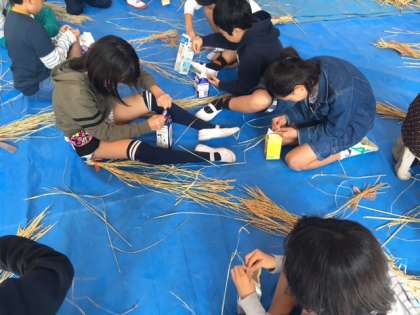 5年生が大切に育てていた岸里米がしっかり乾燥したので、いよいよ脱穀作業に入りました。