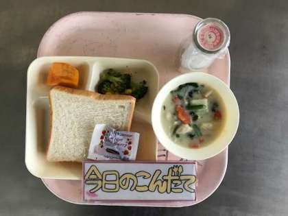 11月14日(火)の献立は「ほたて貝のクリームシチュー・ブロッコリーとコーンのサラダ・かき(富有柿)・食パン・いちごジャム・牛乳」でした。ほたて貝のゆで汁も使用したクリームシチューはほたての風味がおいしく、子どもたちに大好評でした。今日の柿は、和歌山県九度山産の富有柿でした。