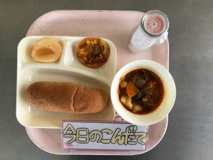 11月20日(月)の献立は「牛肉のケチャップ煮・変わりピザ・白桃(缶)・ライ麦パン・牛乳」でした。変わりピザは子どもに人気の献立です。ツナ、コーン、ピーマンとピザソース、チーズをまぜたものをギョウザの皮の上にのせて焼きました。トースターなどを使っても作れるのでおうちでも作ってみてください。