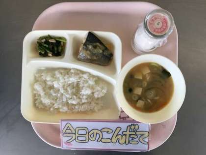 12月7日(木)の献立は「さばのみぞれかけ・みそ汁・こまつなのいためもの・ごはん・牛乳」でした。ゆず風味のみぞれをかけた、焼きさばはさっぱりと仕上げました。それに、旬の葉野菜のこまつなを鶏肉といためた一品と、具だくさんのみそ汁がつきました。今日は、和食の給食でした。