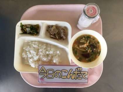12月11日(月)の献立は「豚肉のしょうが焼き・さつまいものみそ汁・きくなとはくさいのごまあえ・ごはん・牛乳」でした。1人45ℊの豚肉を使用したしょうが焼きは、ボリュームがありました。それに、甘いさつまいもの入ったみそ汁と、旬のきくなとはくさいを使ったごまあえがでました。きくなは少し苦みのある野菜ですが、しっかりと食べてくれていました。