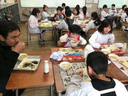 C-NETのアルビー先生が、新年最初の給食を3年1組の教室で食べました。「おぞう煮いっぱい食べたよ!」とお正月の話も聞かせてくれました。正月献立の給食でしたが、アルビー先生も子どもたちも「おいしいよ!」と笑顔で食べてくれていました。