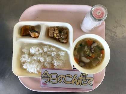 1月15日(月)の献立は「鶏肉と白ねぎのいため煮・のっぺい汁・焼きかぼちゃのごまだれかけ・ごはん・牛乳」でした。のっぺい汁は、日本全国にある郷土料理です。今日の給食ののっぺい汁は、さといも、はくさい、だいこんなど、冬が旬の野菜をたっぷりと使用し、とろみをつけて仕上げました。寒いときに、からだの温まる一品でした。