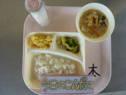 1月18日(木)の献立は「かす汁・ブロッコリーのごまあえ・くりきんとん・ごはん・牛乳」でした。かす汁は、酒かす、みそなどで味つけした、具だくさんで体の温まる汁ものでした。くりきんとんは、おせち料理の一品で、色合いが黄金色に輝く宝のようなことから、富や繁栄を願う気持ちがこめられてつくられます。