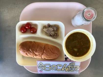 1月19日(金)の献立は「豚肉のしょうゆマヨネーズ焼き・カレースープ・プチトマト・レーズンパン・牛乳」でした。子どもたちの好きなマヨネーズで下味をつけて焼き物機で焼いた豚肉は好評でした。少し辛めに仕上がったカレースープも体が温まりました。給食カレンダーには、3色食品群の栄養に関する問題がのっています。今日は「プチトマト」の問題でした。