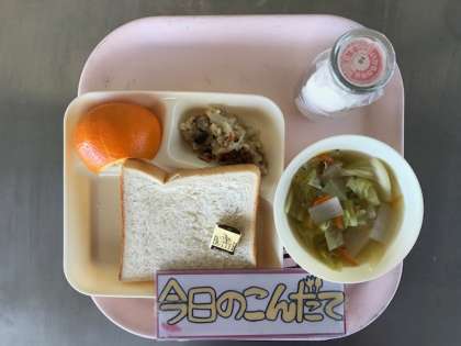 2月7日(水)の献立は「押し麦のグラタン・スープ・いよかん・食パン・バター・牛乳」でした。普段、なかなか食べる機会の少ない押し麦を、子どもたちの好きなグラタンに使いました。グラタンに入れることで食べやすくおいしく食べてもらえました。それに、静岡県産のいよかんがつきました。