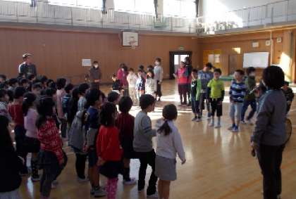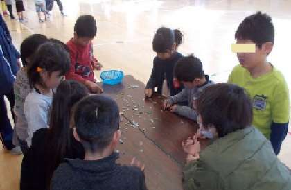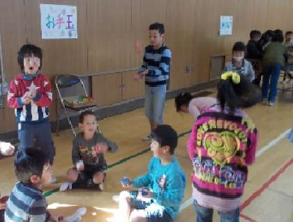 1年生が昔遊び大会にさくらんぼの友達を招待してくれました。