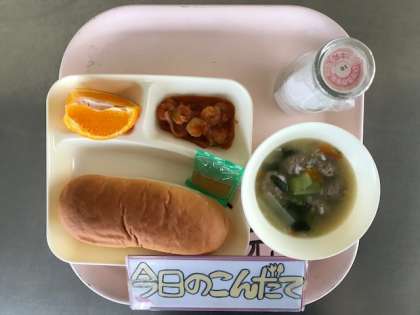 3月5日(月)の献立は「えびのチリソースいため・中華がゆ・デコポン・コッペパン・リンゴジャム・牛乳」でした。子どもたちの好きな肉だんごがたっぷり入った中華がゆは、最後に加えるごま油の風味がきいておいしく仕上がっていました。子どもたちにも大好評でした。今日のデコポンは、和歌山県産でした。