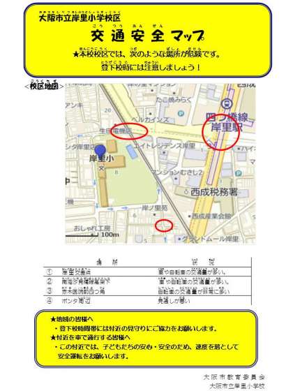 岸里小学校周辺は車の通りや自転車の往来も多く、細い路地もあるため、登下校時は安全に気をつけましょう。