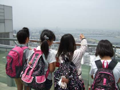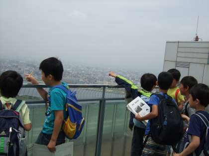 環状線に乗って沿線の様子を見ながら、大阪駅にある梅田スカイビルの空中庭園展望台を目指しました。車内から見えたものや展望台から見て発見したことなど、子どもたちは気づいたことを一生懸命メモしていました。