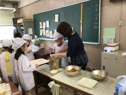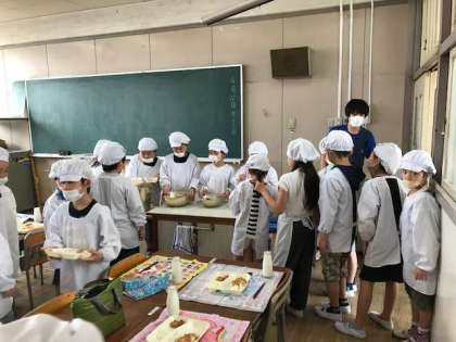3年生になり、配膳も手慣れたものです。子どもたち中心に、てきぱきと給食の準備をしていました。3年生になると、ごはんの量は150gから170gに、パンは50gから60gに増えています。パンが大きくなっていることに、気づいている子もいました。量が増えても、しっかり食べていました。