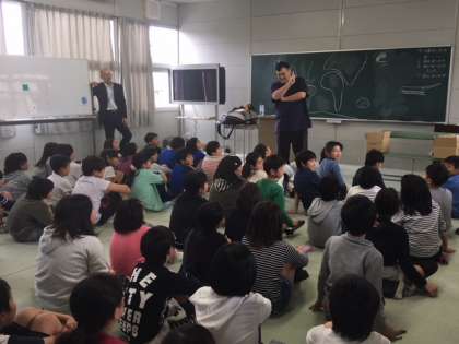 10日は、外国語の授業の1回目がありました。アレックス先生の出すクイズにたくさんの子どもたちが手を挙げて答えていました。
