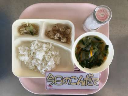 4月16日(月)の献立は「鶏肉のからあげ・中華スープ・チンゲンサイともやしの甘酢あえ・ごはん・牛乳」でした。子どもたちの大好きなからあげがでました。「給食のからあげは、カラッと揚がっていて、おいしい!」とほめてもらいました。