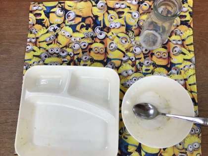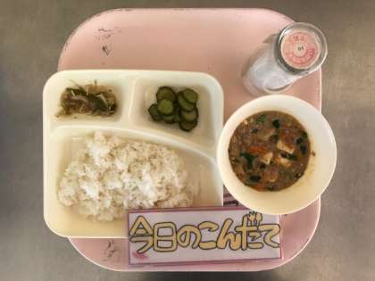 4月23日(月)の献立は「マーボーどうふ・きゅうりの甘酢づけ・もやしとピーマンのごまいため・ごはん・牛乳」でした。野菜たっぷりの副菜も、残さず食べていました。マーボーどうふはごはんが進みました。お皿もおわんも、ピカピカに食べてくれている1年生が何人もいました。