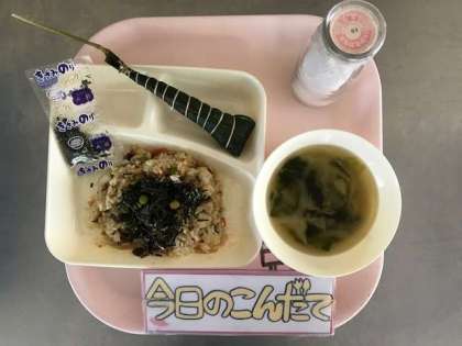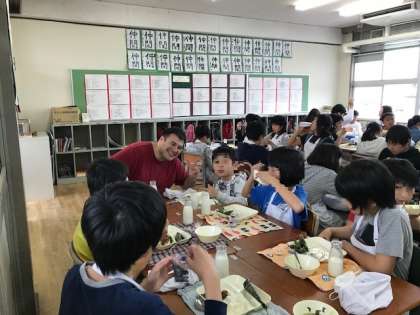 5月2日(水)の献立は「牛肉のちらしずし・すまし汁・ちまき・牛乳」でした。今日は、こどもの日の行事献立で、ちまきがでました。「ちまき、おいしかった!」の声もちらほら聞こえてきました。C-NETのアレックス先生が、6年生のクラスで給食を食べました。