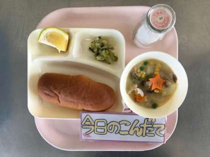 5月8日(火)の献立は「コーンクリームシチュー・キャベツのひじきドレッシング・河内ばんかん・黒糖コッペパン・牛乳」でした。河内ばんかんは、年に1回登場するグレープフルーツのように果汁がたっぷりで、さわやかな甘みがおいしいかんきつ類です。鹿児島県産の河内ばんかんでした。