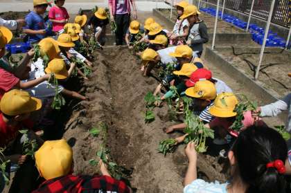 学習園にサツマイモのなえを植えました。秋に大きなお芋ができるように水やりもがんばります。大きなおいもがたくさん収穫できますように。