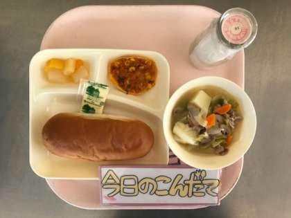 5月14日(月)の献立は「豚肉と野菜のスープ煮・変わりピザ・ミックスフルーツ(缶)・コッペパン・マーガリン・牛乳」でした。変わりピザは、子どもたちに人気の献立です。餃子の皮を、ピザ生地にしてツナ、コーン、ピーマンをピザソースであえたものをのせチーズをのせて焼いています。