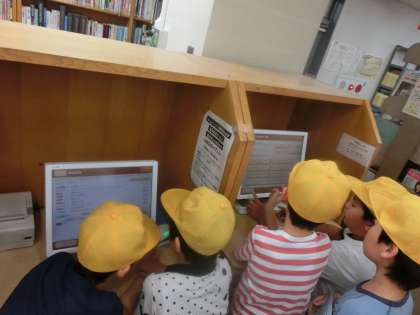 「ポケモンの本があるかな?」パソコンで調べました。本には番号があって、すぐに見つかりました。