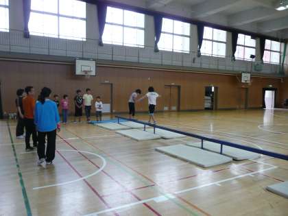 まず始めに、平均台の上をバランスよく歩く運動をしました。最後まで渡りきる子や、途中で落ちてしまう子も、みんな楽しむことができました。