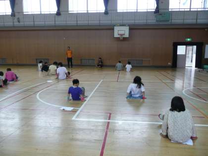 最後に雑巾がけレースを行いました。雑巾をお尻に敷いて端から端まで移動するのですが、慣れない運動でみんな苦戦していました。しかし、2回目は慣れたようでスイスイ移動できるようになりました。