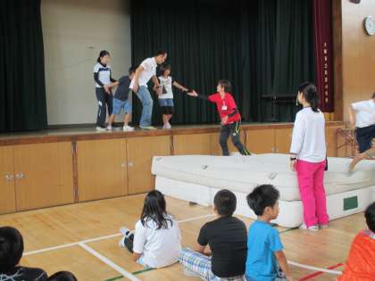 マットを使った運動では、舞台の上から色々な跳び方でマットの上に跳び込み、少し高いところから落ちる感覚をみんなで楽しみました。