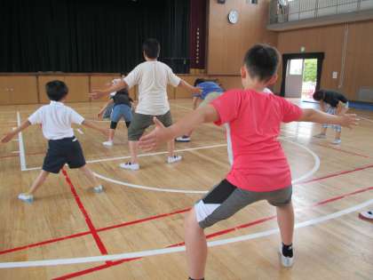 次のさくらんぼ体操では、音楽のリズムに合わせて体操を行いました。音楽のリズムに合わせることで、みんな一層楽しみながら体操をすることができました。