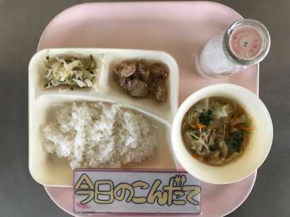 7月5日(木)の献立は「鶏肉のしょうゆマヨネーズ焼き・五目汁・切り干しだいこんののゆずの香あえ・ごはん・牛乳」でした。切り干しだいこんは、生のだいこんよりも少ない量で食物繊維をたくさん取ることができます。煮もので食べることが多いですが、サラダのような一品として登場しました。