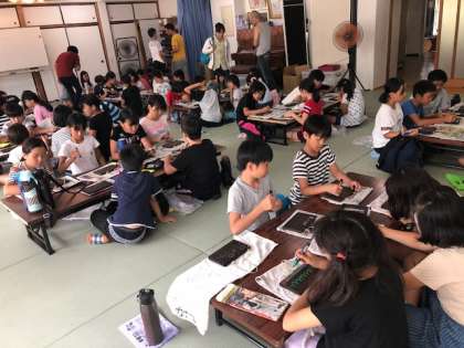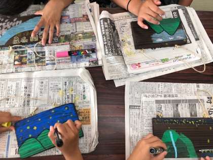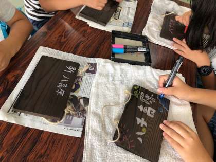 昨日、すすを落としピカピカに磨いた焼き板に、川や星空、美しい山々など思い思いのデザインを描いています。出来上がりが楽しみです。この後、3時ごろから今日の夕食になるカレー作りを始める予定です。