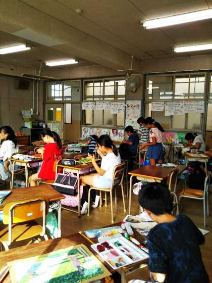 2組は、図画工作の時間です。絵を描いて、額縁も手作りです。段ボールの波型を使って色付けをして上手に額縁をつくっています。