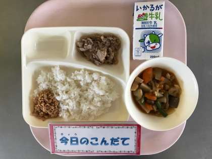 10月4日(木)の献立は「豚肉のねぎじょうゆ焼き・ふきよせ煮・ツナ大豆そぼろ・ごはん・牛乳」でした。ツナ大豆そぼろは、ツナとひき割り大豆をしょうが風味で味つけしたごはんがすすむ一品でした。旬のさといもやれんこんが入ったふきよせ煮は季節を感じる煮ものでした。