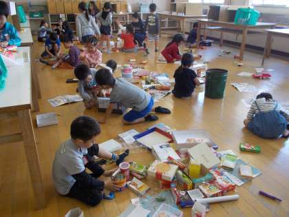 1年生が、箱や空き容器を持ち寄り、かたちあそびをとおして、グループで作るものを考え、作品をつくりました。作品ができると、作品発表会をしました。