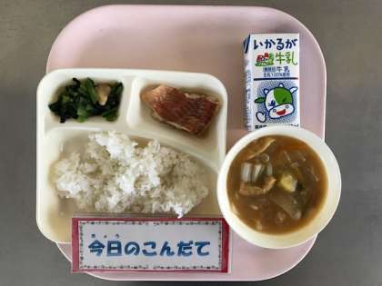 11月1日(木)の献立は「赤魚のしょうゆだれかけ・さつまいものみそ汁・こまつなのいためもの・ごはん・牛乳」でした。赤魚は骨も少なく、食べやすく子どもたちに人気の魚献立です。予定では、おおさかしろなの炒めものでしたが、天候の影響で野菜が供給できず、こまつなに変更になりました。こまつなのいためものを、赤魚のしょうゆだれかけ・さつまいものみそ汁とともに、とてもおいしくいただきました。