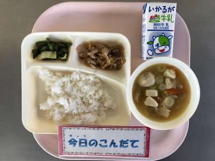 11月6日(火)の献立は「豚肉のしょうがじょうゆかけ・けんちん汁・三度豆のからしじょうゆあえ・ごはん・牛乳」でした。さといも、だいこん、れんこん、にんじんとこれからが旬の根菜が、たっぷり入ったけんちん汁はだしの味がきいた一品でした。