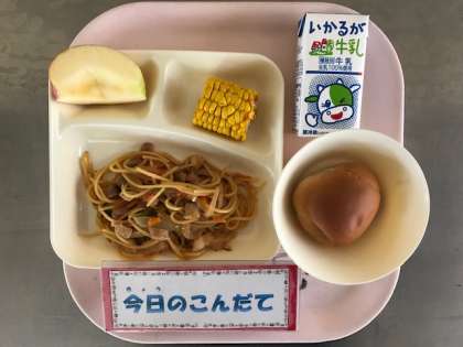 11月15日(木)の献立は「チキントマトスパゲッティ・焼きとうもろこし・りんご・1/2黒糖パン・牛乳」でした。スパゲッティは子どもたちに人気の献立です。今回も大好評でした。今日のりんごは、青森県産でした。