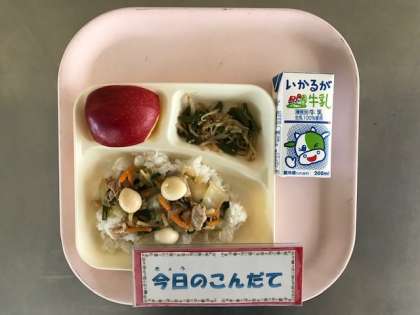 11月22日(木)の献立は「中華丼(うずら卵)・もやしの中華あえ・りんご・牛乳」でした。中華丼は、うずら卵の個別対応献立になっていました。はくさい、たまねぎ、たけのこ、にんじん、にら、しいたけと野菜等がたっぷりとれる献立でした。今日のりんごは青森県産でした。
