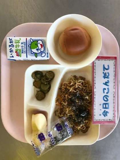 12月12日(水)の献立は「オイスターソース焼きそば・きゅうりの中華あえ・りんご・1/2黒糖パン・牛乳」でした。焼きそばは子どもたちに人気の献立です。今日もしっかり食べていました。長野県産のりんごは、蜜入りのものもあり、とてもおいしかったです。
