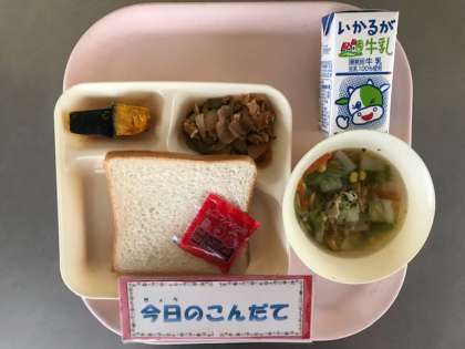 12月20に日(木)の献立は「豚肉のケチャップソテー・はくさいのスープ・焼きかぼちゃ・食パン・いちごジャム・牛乳」でした。