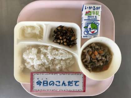 今日は、れんこんやごぼうなどの根菜類やひじき豆の大豆としっかりとかんで食べたい食材の献立でした。