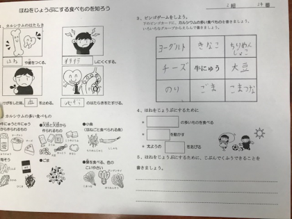 骨の材料のカルシウムの働きや、カルシウムの多い食べ物を、ビンゴゲームをしながら楽しく学習しました。また、カルシウムをより吸収しやすくするためにはどうすればよいか?なども学びました。