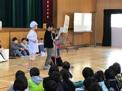 今日の集会で、給食委員会の児童が給食について発表しました。
