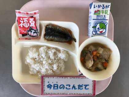 2月4日(金)の献立は、節分の行事献立の「いわしのしょうがじょうゆかけ・含め煮・いり大豆・ごはん・牛乳」でした。福豆の袋の裏に、「節分の由来」が書いてありました。とても小さなコメントでしたが、気が付いて読んでくれている児童がいました。いわしも、開いて甘辛いタレがかかっていて食べやすかったです。
