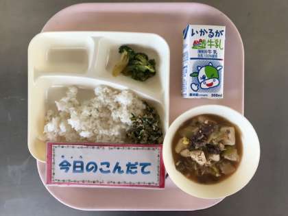 2月8日(金)の献立は「すき焼き煮・ブロッコリーのしょうがづけ・ツナっ葉いため・ごはん・牛乳」でした。すき焼き煮は、煮汁をたっぷり吸ったふがおいしい一品でした。給食室で作る、ツナとだいこん葉のふりかけも、毎回子どもたちには好評な献立です。上手にごはんに混ぜながら食べていました。