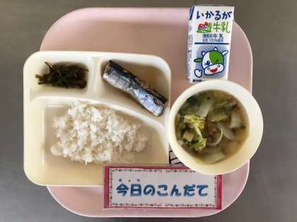 2月14日(木)の献立は「さんまのみぞれかけ・すまし汁・くきわかめのつくだ煮・ごはん・牛乳」でした。くきわかめは、わかめの葉の芯の部分で、コリコリとした歯ごたえが特徴です。このくきわかめを、つくだ煮にしました。食感を楽しみながら食べました。