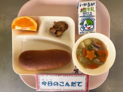 3月1日(金)の献立は「鶏肉のみそバターソース・スープ煮・デコポン・黒糖パン・牛乳」でした。鶏肉のみそバターソースは、今回初めて登場した献立です。八丁みそ、赤みそ、砂糖、バターで作ったソースは子どもたちにも人気でした。みずみずしく、甘いデコポンは、和歌山県産でした。