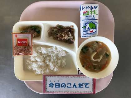 3月7日(木)の献立は「豚肉のごまだれ焼き・みそ汁・こまつなのおひたし・ごはん・牛乳」でした。こまつなのおひたしには、個包装のかつおぶしがつきました。こまつなに、かけてあまったかつおぶしは、「ごはんにかけて食べてるとおいしいよ!」と教えてくれる児童もいました。